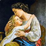 طرح مهر مادری یا مادر و کودک یکی از شناختهشدهترین و پرمعنیترین موضوعات در هنر تابلو فرش است. مادر در این اثر با حالتی پر از مهربانی کودک را در آغوش گرفته و با نوازش و بوسیدن پیشانی او عشقی بیقید و شرط را نمایش میدهد. حالت چهره کودک و نگاه رو به بالای او، حس اعتماد، محبت و ستایش را به بیننده منتقل میکند و تصویری بسیار طبیعی و زنده ایجاد مینماید. این تابلو فرش نمونهای کامل از هنر تابلو فرش صورت یا چهره است که توانسته ظرافتهای انسانی و ابراز احساس را به خوبی طراحی کند.